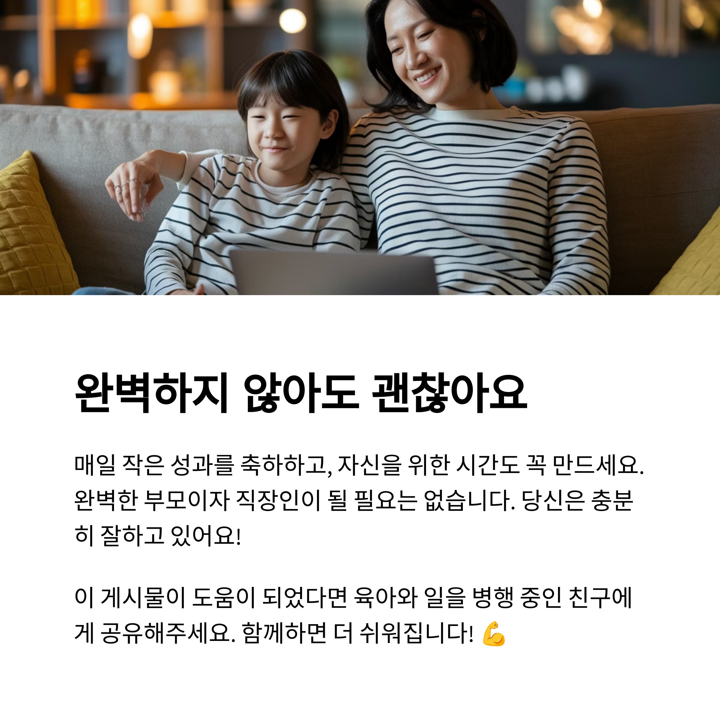 업무 체크리스트 작성, 할 일 우선순위 정하기는 필수입니다. 업무 시작 전 오늘의 주요 업무를 명확히 하고, 짧은 시간에도 효율적 작업이 가능하도록 계획하세요. 필요 시 배우자나 가족과 협력해 육아를 나누는 것도 좋은 방법입니다.