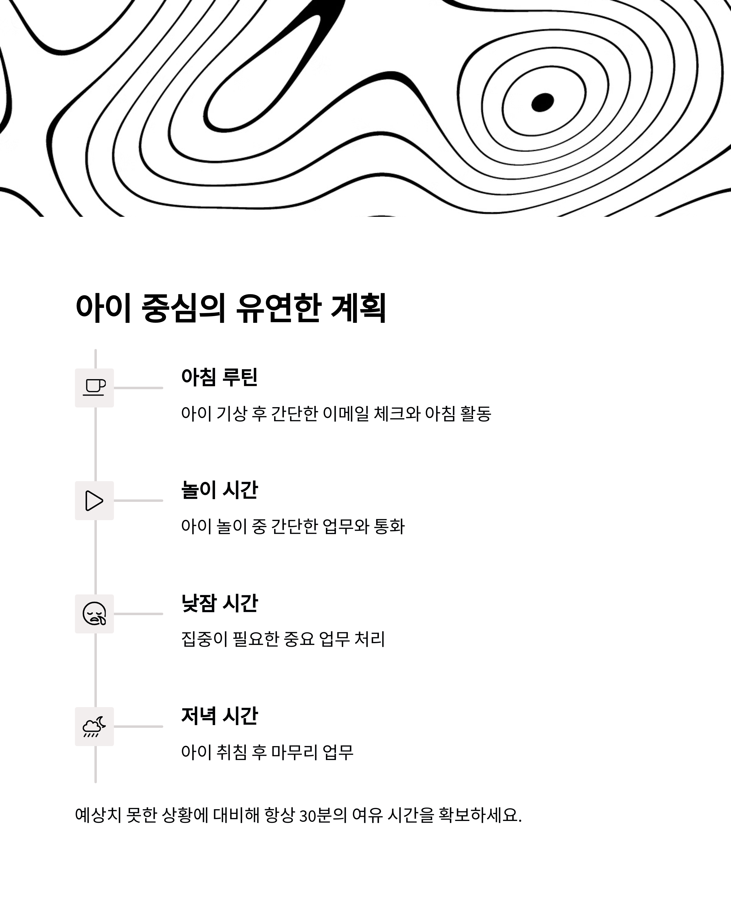 아이의 루틴을 활용하세요. 낮잠이나 놀이 시간에 집중 업무를 배치하거나 간단한 놀이감으로 혼자 놀 수 있는 환경을 만들어 주세요.