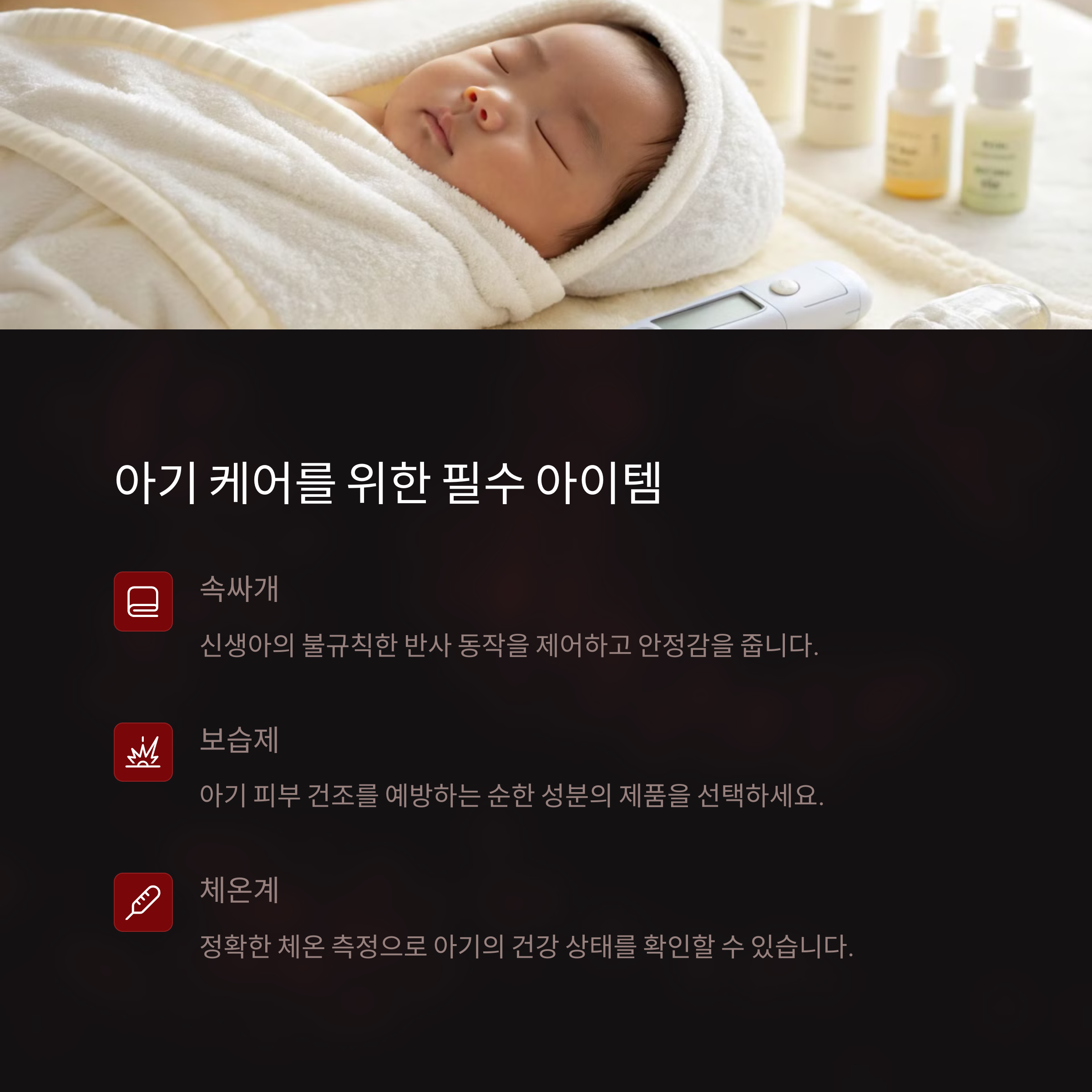 자주 사용하는 기본 아이템 위주 | 자세, 안정감, 수면환경을 고려한 구성 | 아기의 건강과 피부 상태를 위한 필수 아이템 |