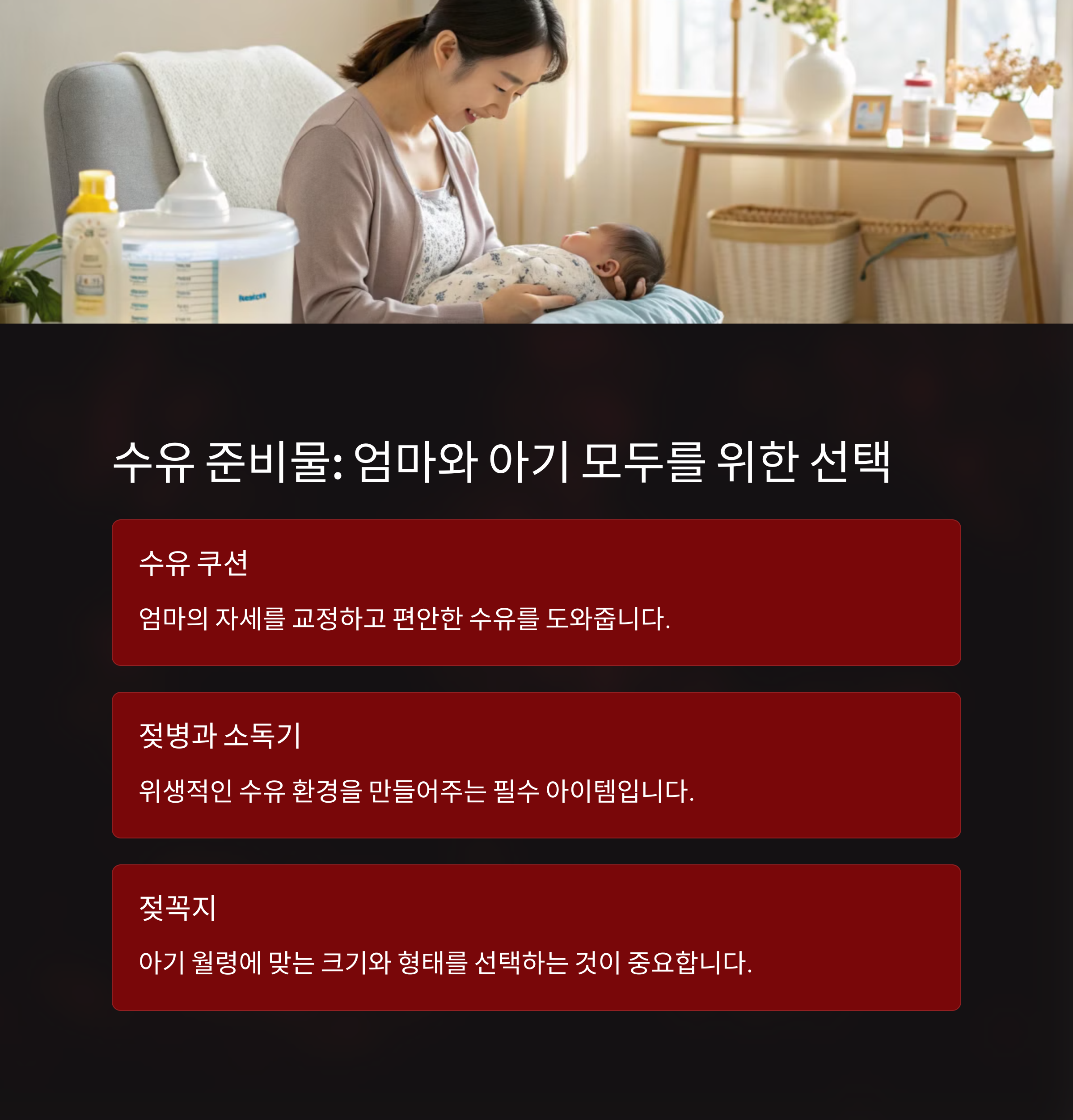 | 자주 사용하는 기본 아이템 위주 | 자세, 안정감, 수면환경을 고려한 구성 | 아기의 건강과 피부 상태를 위한 필수 아이템 |