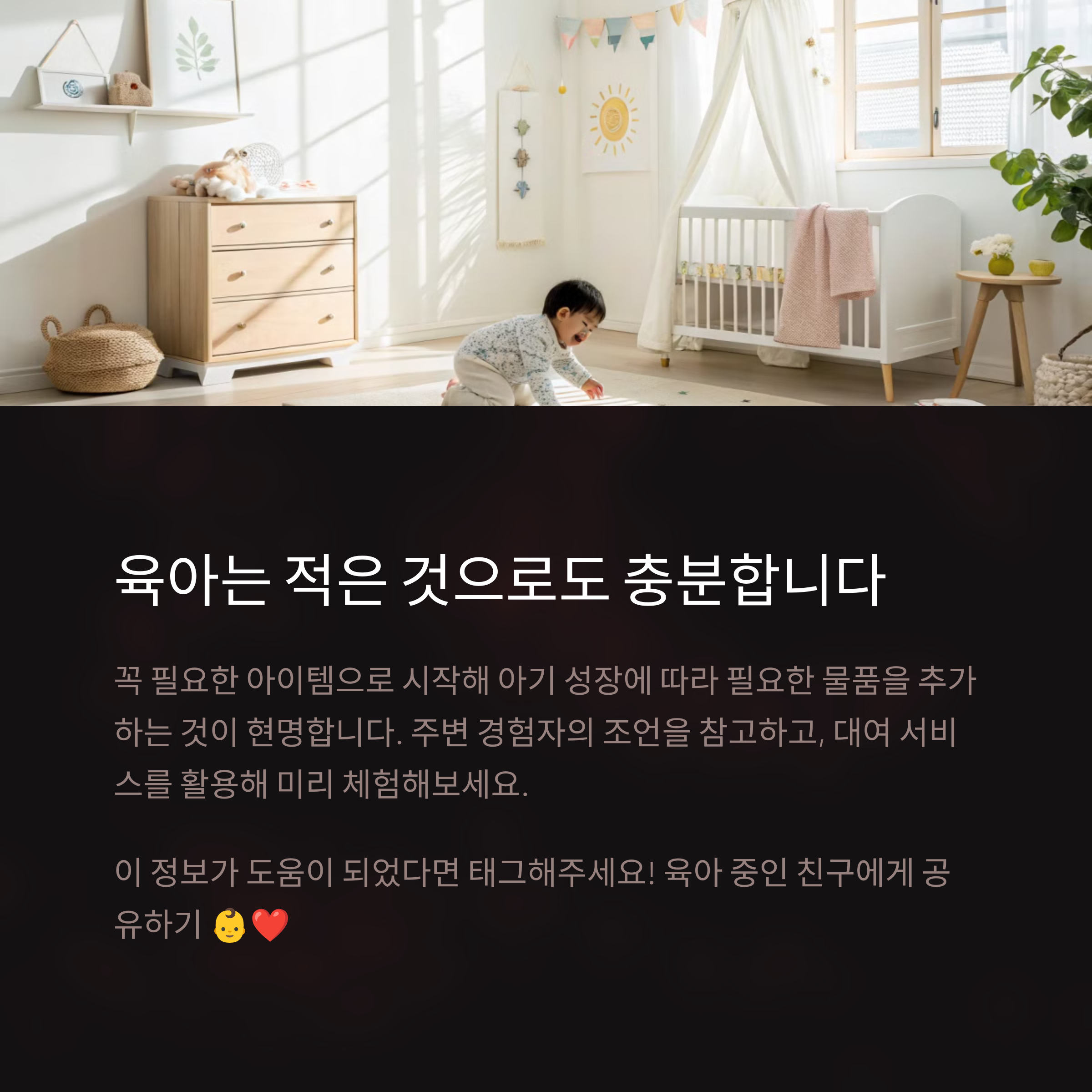 육아 용품은 많다고 좋은 게 아니라, 내 아기에게 맞고 내가 편한 것이 가장 좋은 선택입니다. 꼭 필요한 10가지로 실속 있고 똑똑한 육아를 시작해보세요.