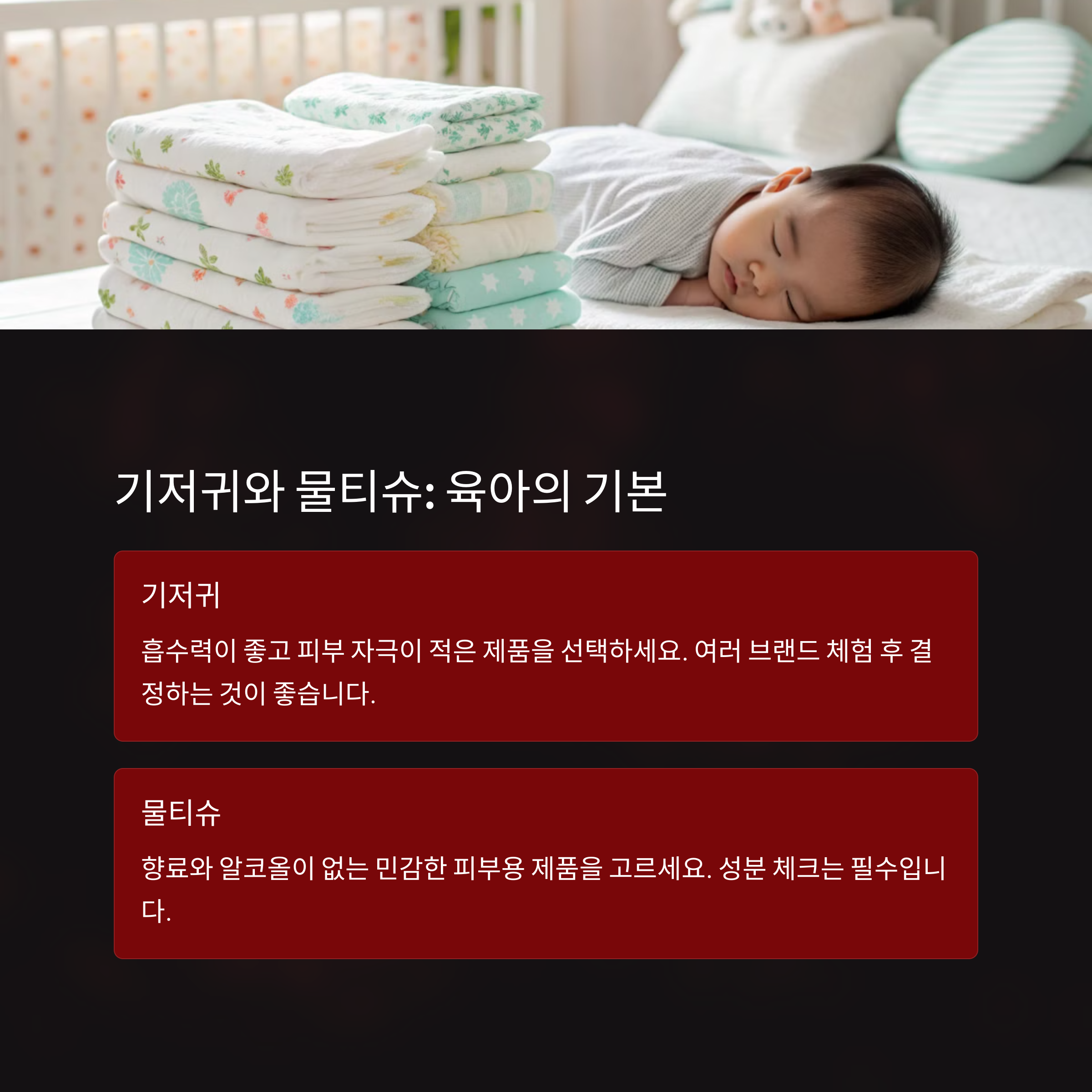 | 자주 사용하는 기본 아이템 위주 | 자세, 안정감, 수면환경을 고려한 구성 | 아기의 건강과 피부 상태를 위한 필수 아이템 |