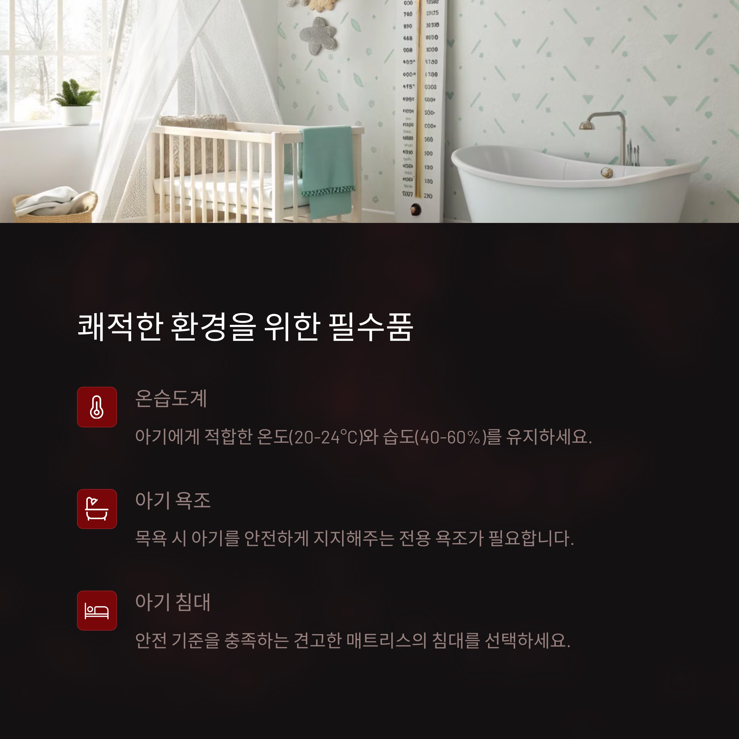 | 기저귀, 물티슈, 속싸개, 아기욕조 | 수유 쿠션, 침대/요람, 젖병, 젖병 소독기 | 온습도계, 체온계, 보습제 |
