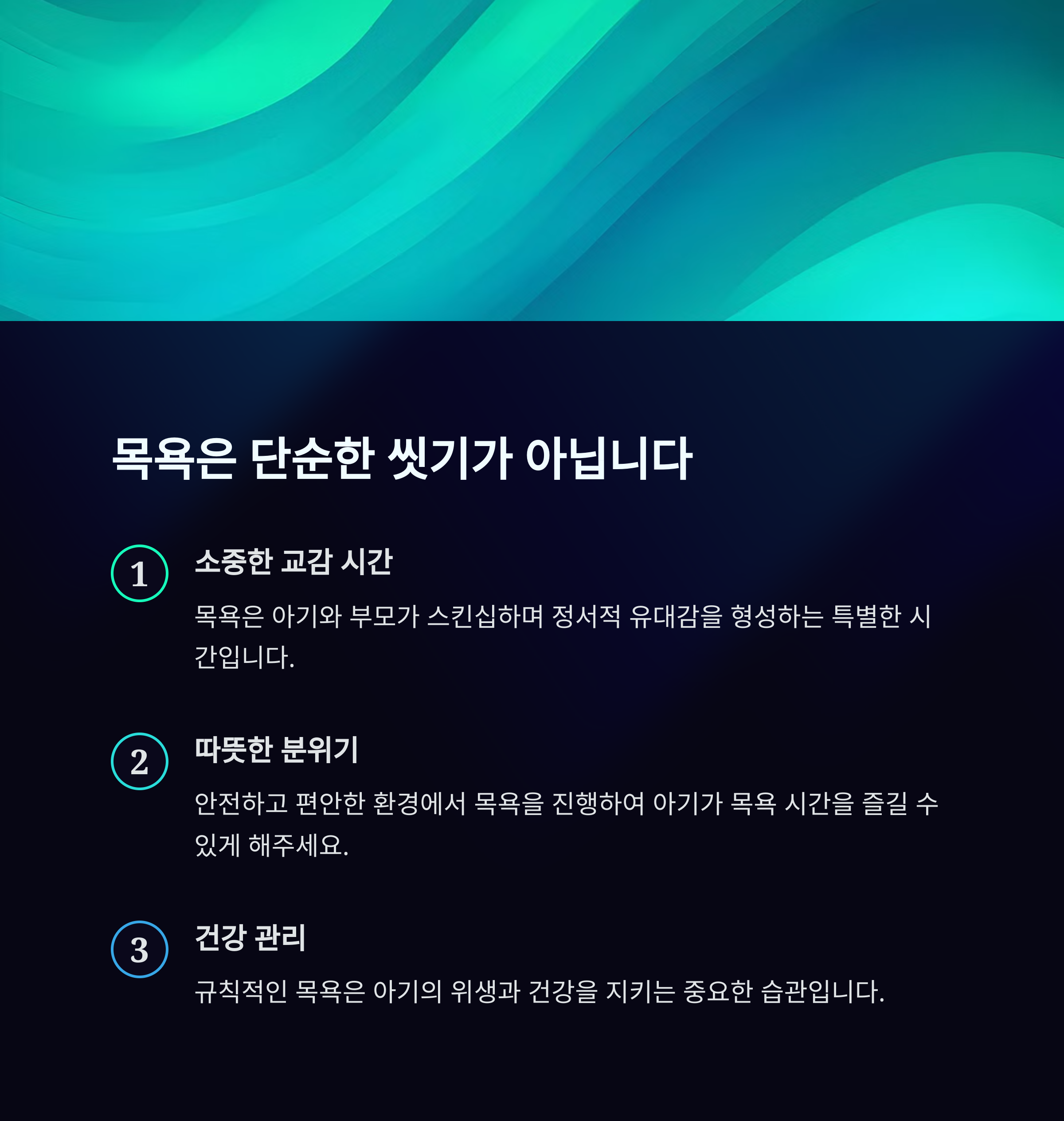 신생아 목욕은 아기의 건강과 부모와의 유대감을 높이는 소중한 시간입니다. 적절한 준비와 순서를 잘 익히고 실천하면 아기에게도, 부모에게도 편안하고 즐거운 시간이 될 수 있습니다.
