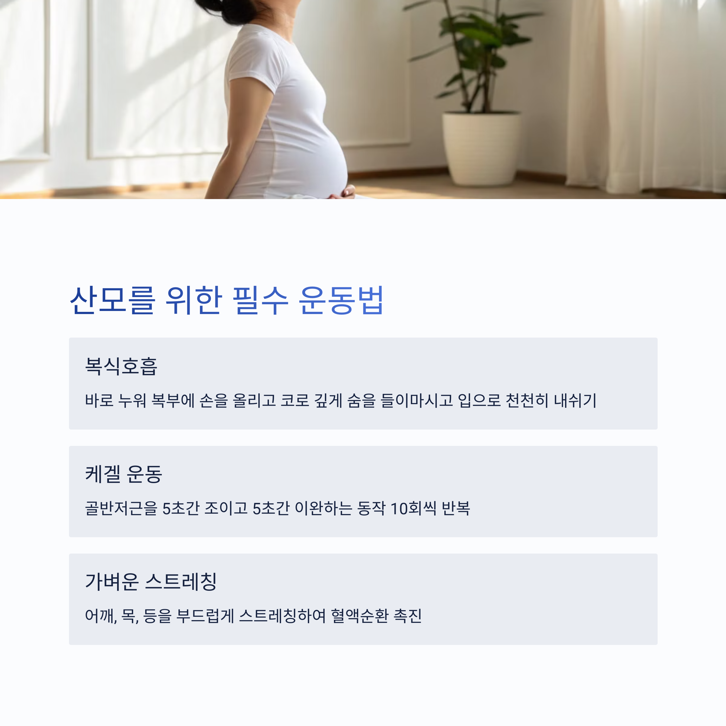 | 복식 호흡 | 케겔 운동 | 산후 유의사항 |