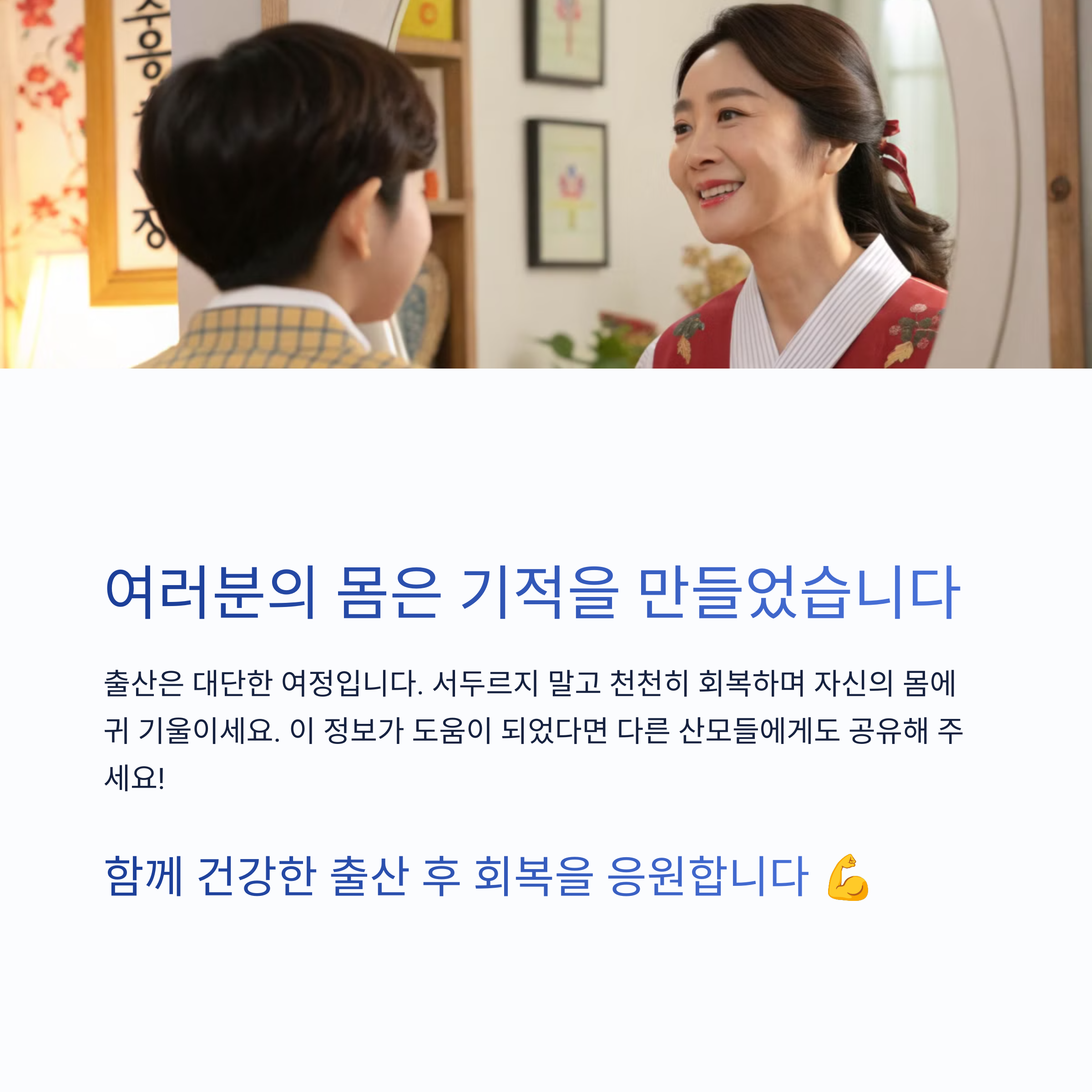 산후 회복 운동이나 도움이 되었던 습관이 있다면 댓글로 남겨주세요. 다른 분들에게도 큰 도움이 됩니다.