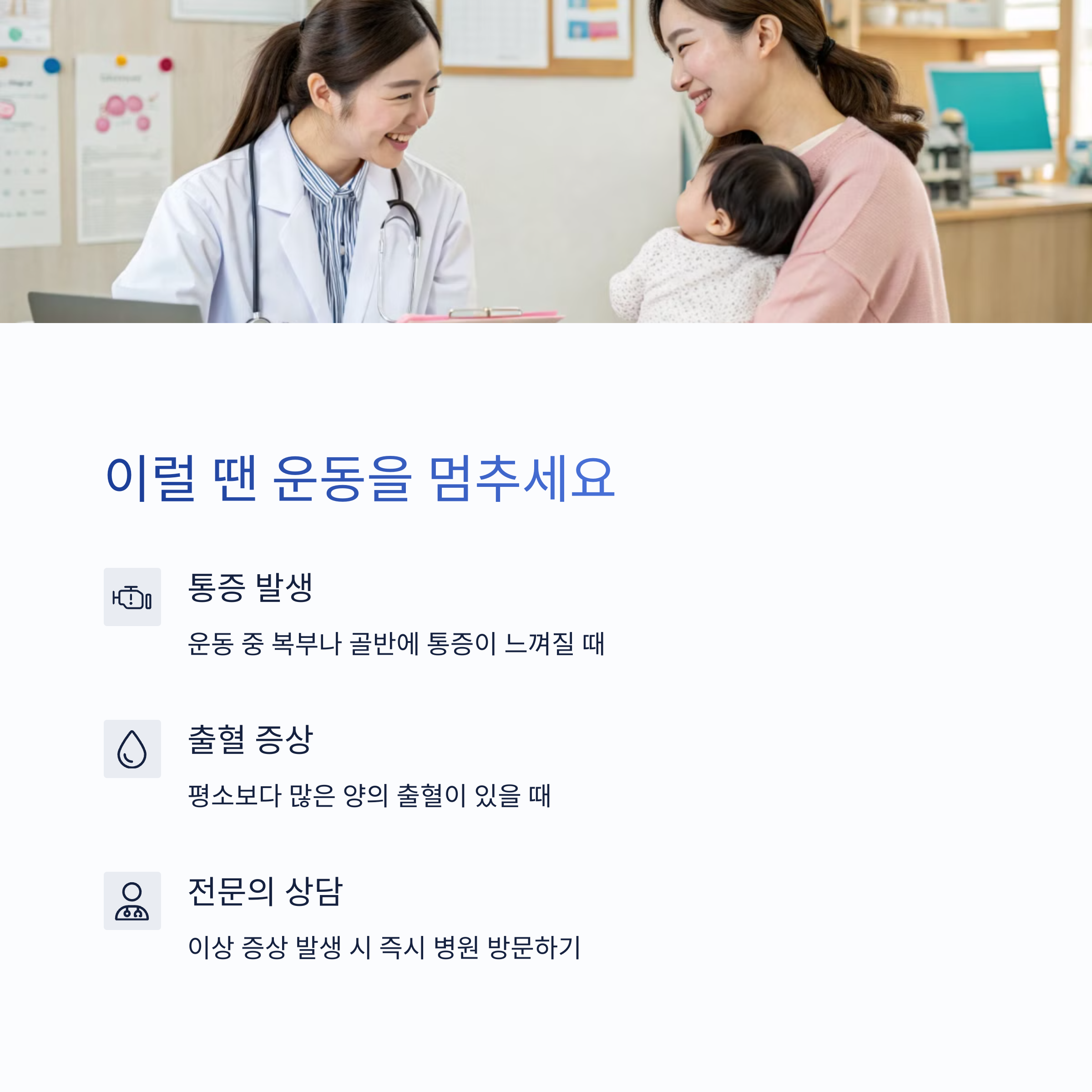 | 깊은 호흡으로 복부 근육을 부드럽게 자극하여 회복을 돕습니다. | 골반 저근을 강화해 요실금 예방과 체형 회복에 효과적입니다. | 통증, 출혈이 있을 경우 운동을 중단하고 전문의 상담이 필요합니다. |