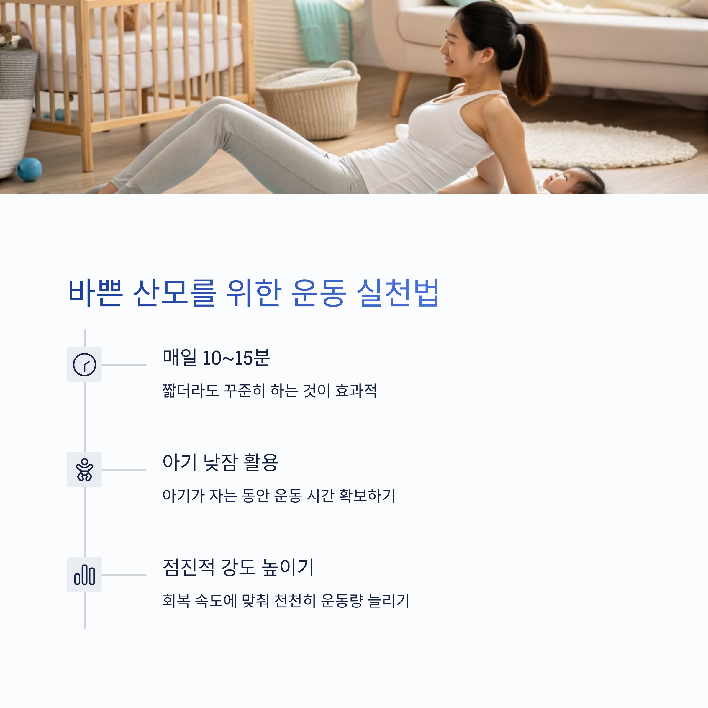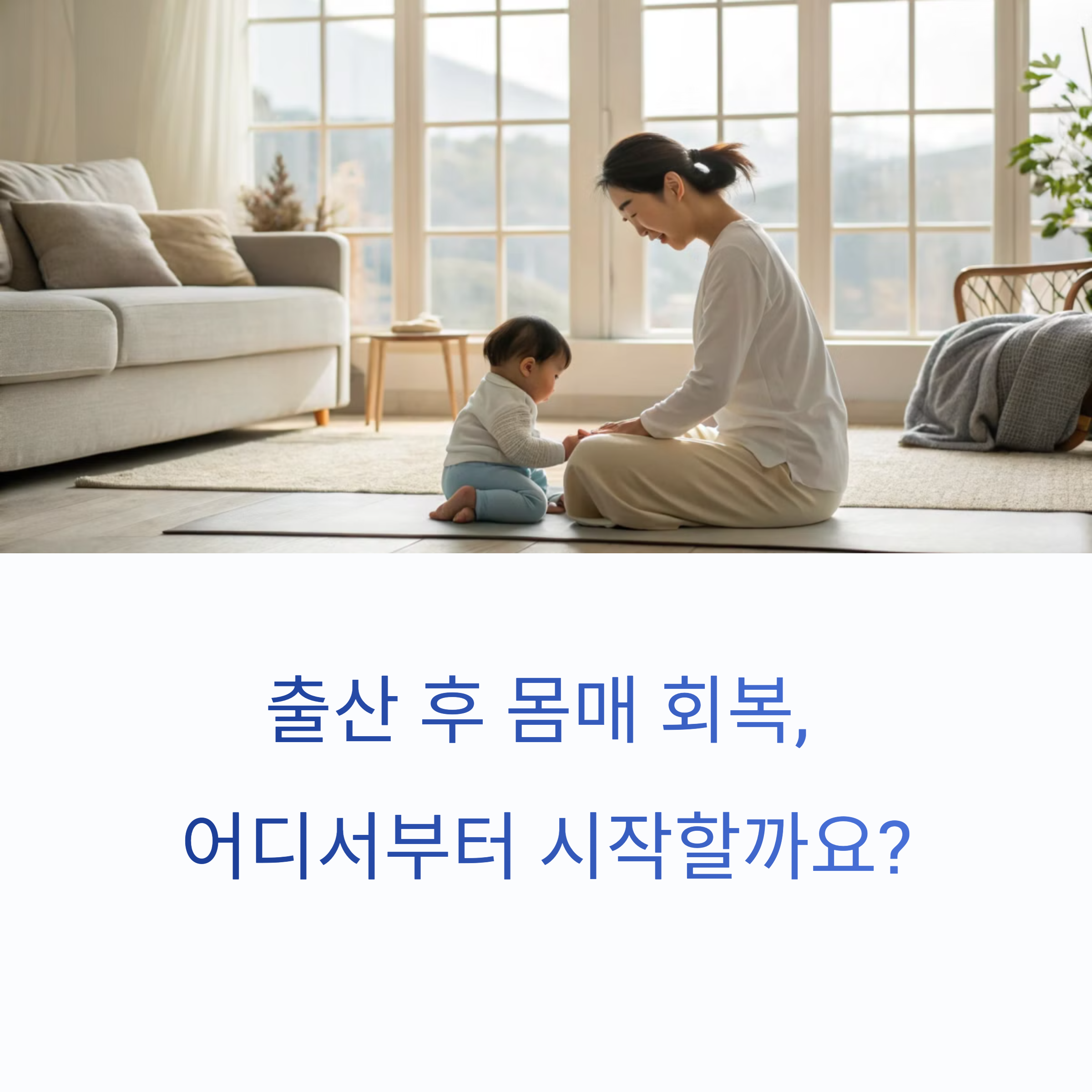 산후 운동은 빠른 회복보다는 건강한 회복을 목표로 해야 합니다. 짧게라도 매일 몸을 움직이는 습관을 들이고, 통증이나 출혈 등 이상이 있을 경우 즉시 중단하고 전문의와 상담하는 것이 안전합니다. 운동은 나를 위한 회복의 루틴입니다.