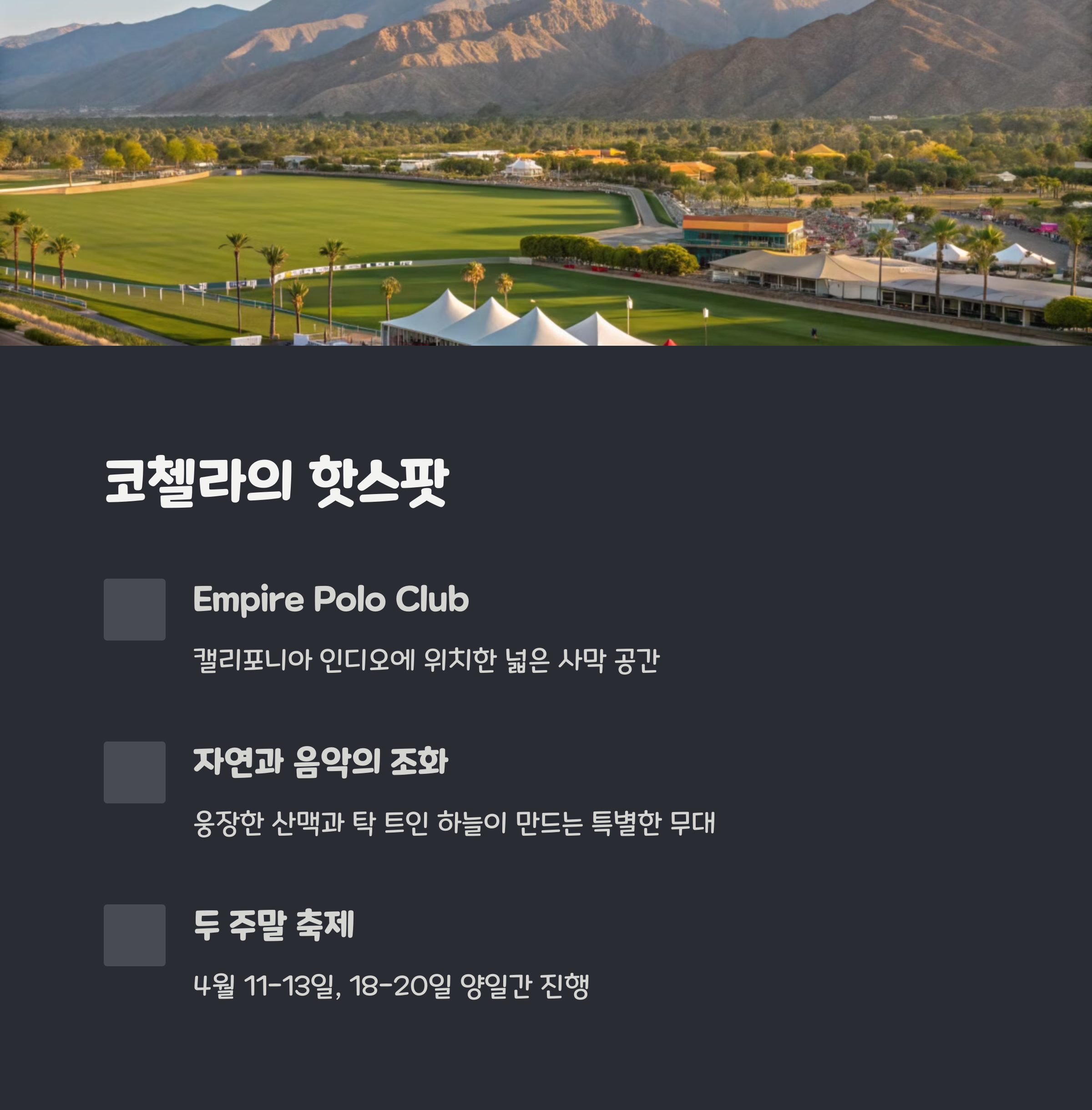 축제 현장인 Empire Polo Club은 캘리포니아 사막의 아름다운 풍경과 어우러져, 독특하며 잊지 못할 경험을 제공합니다.