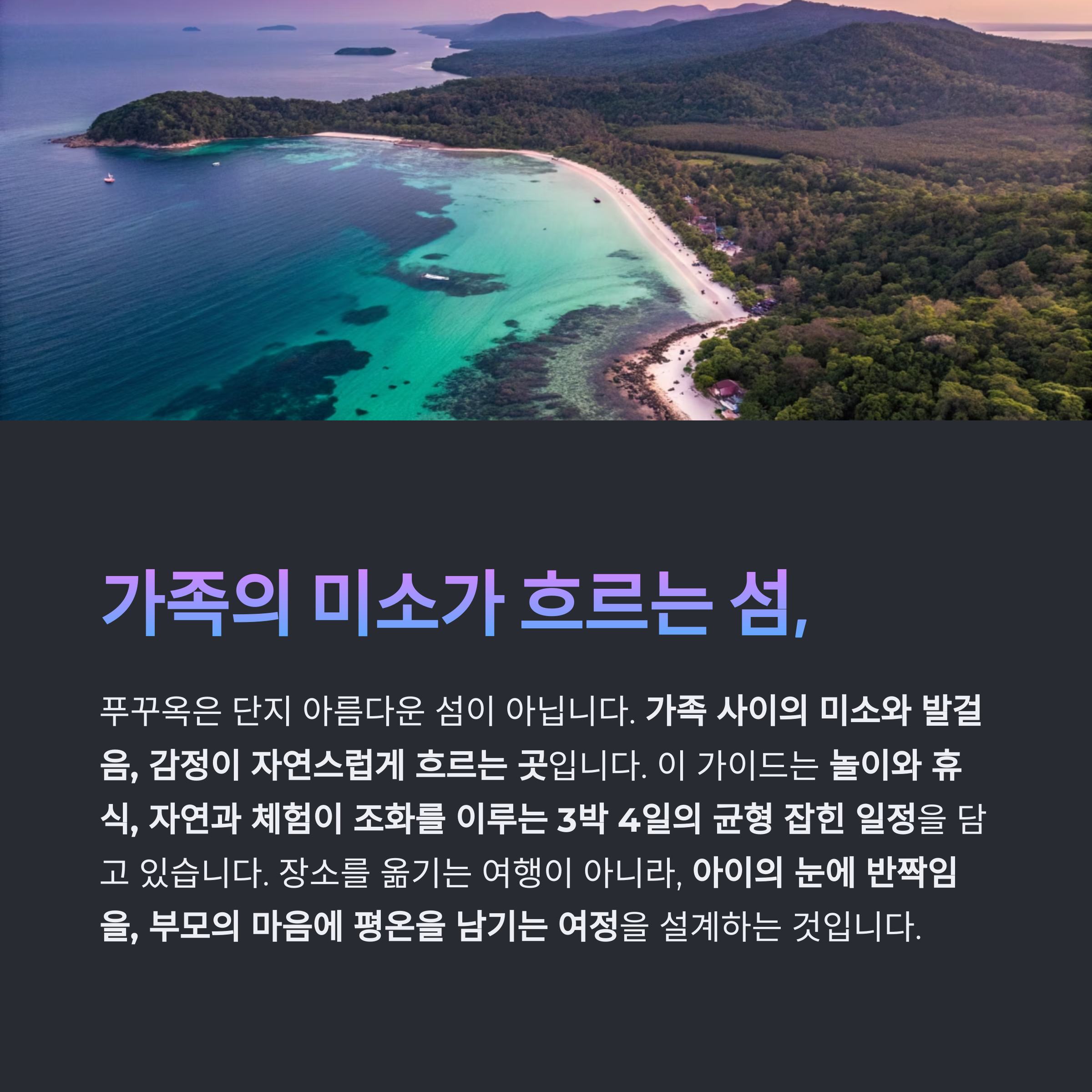 이 가이드는 놀이와 휴식, 자연과 체험이 조화를 이루는 3박 4일의 균형 잡힌 일정을 담고 있습니다.
