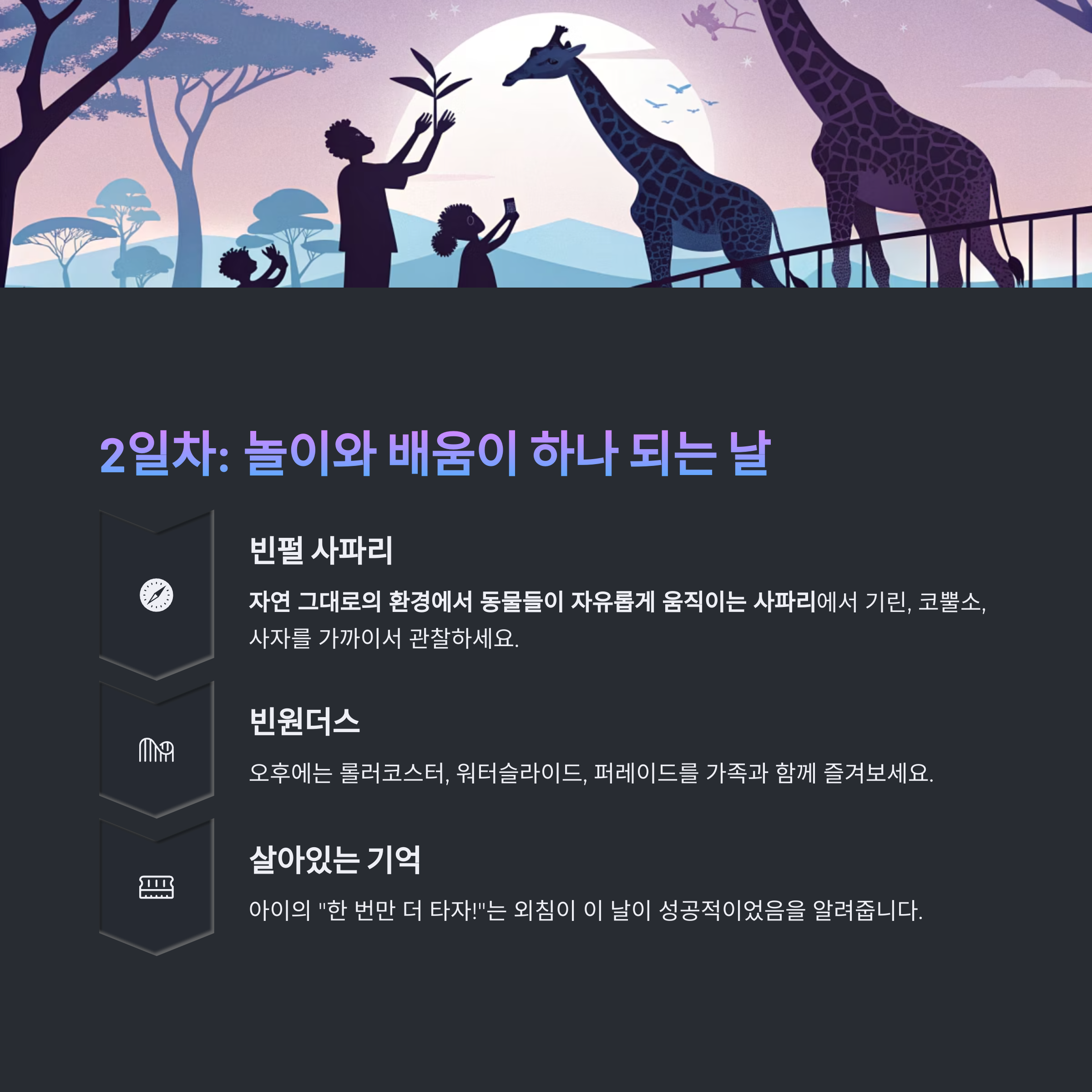 | 2일차 | 사파리 & 테마파크 | 놀이와 배움의 균형 |