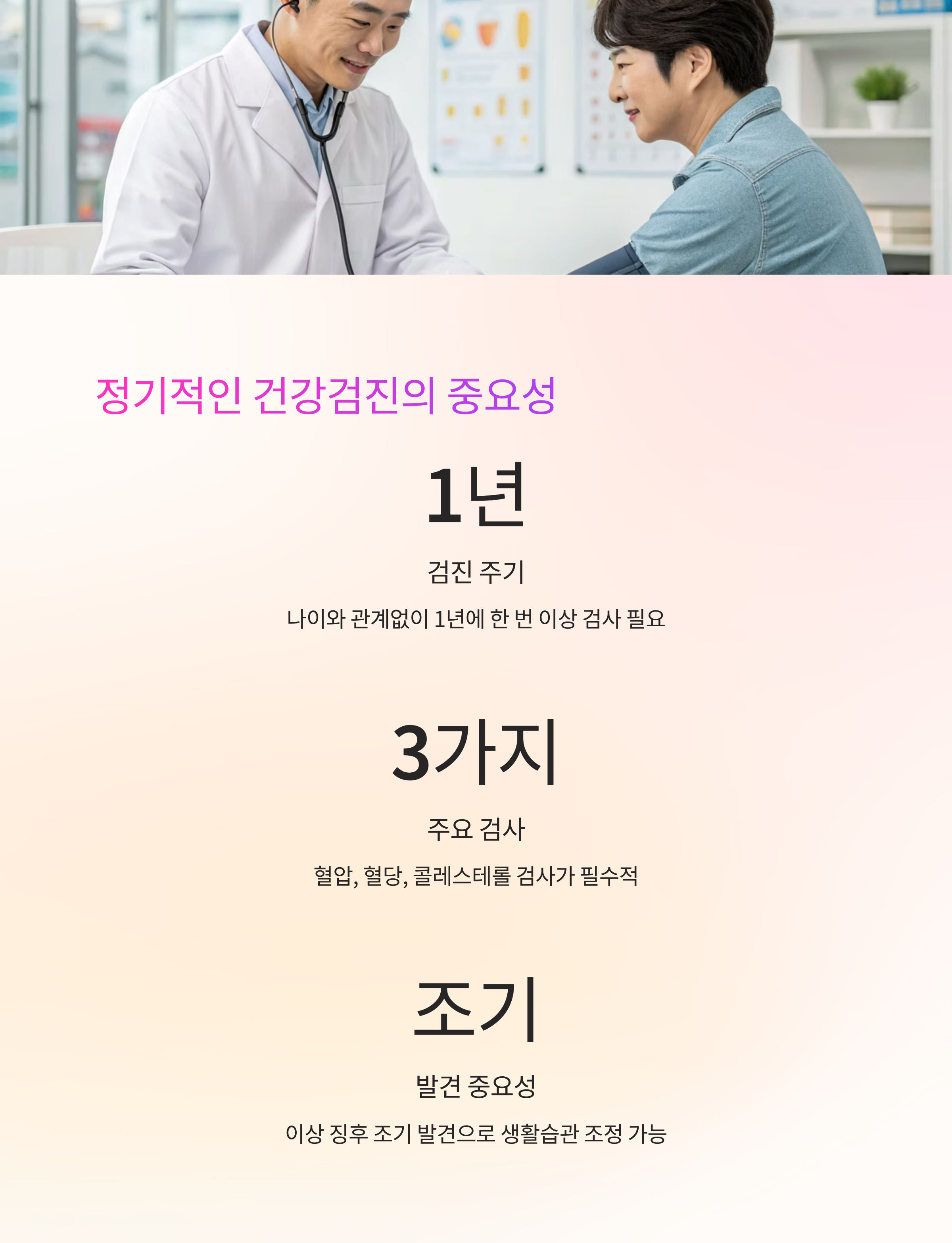나이에 관계없이 1년에 한 번 이상 혈압, 혈당, 콜레스테롤 검사를 받는 것이 권장됩니다.