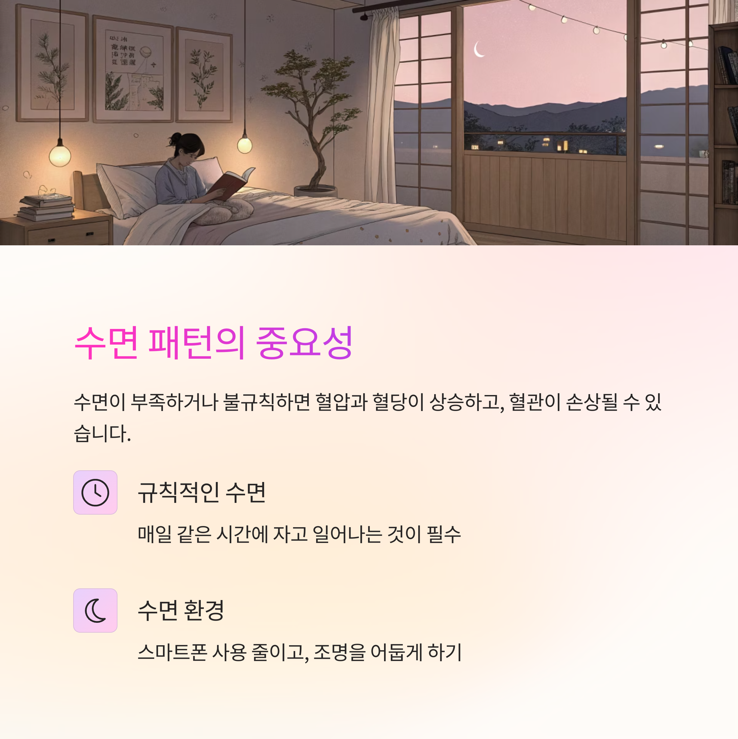 수면이 부족하거나 불규칙하면 혈압과 혈당이 상승해 혈관을 손상시킬 수 있습니다.