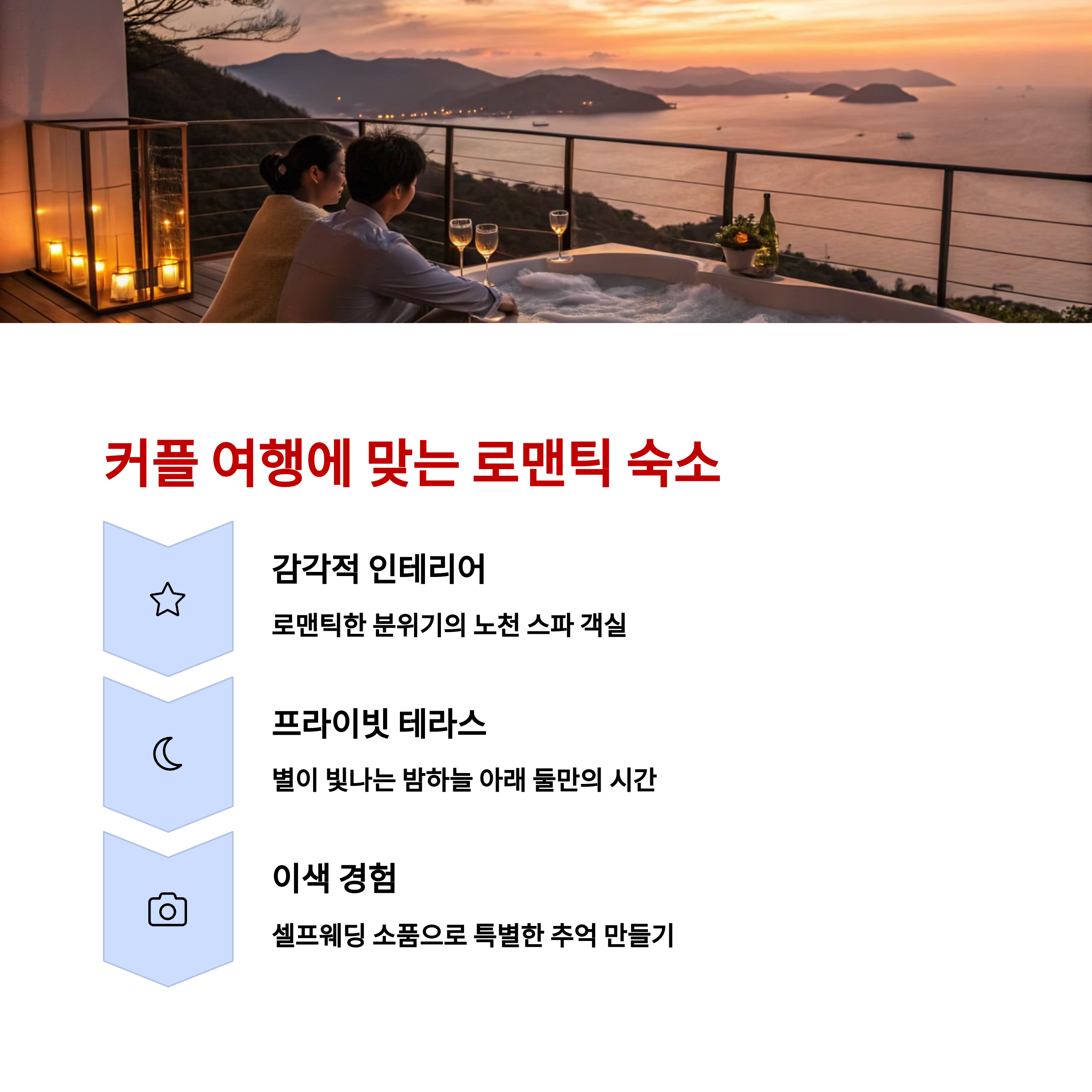오션뷰 테라스, 스파, 분위기 있는 조명까지 둘만의 추억을 쌓기에 충분한 공간이지요.
