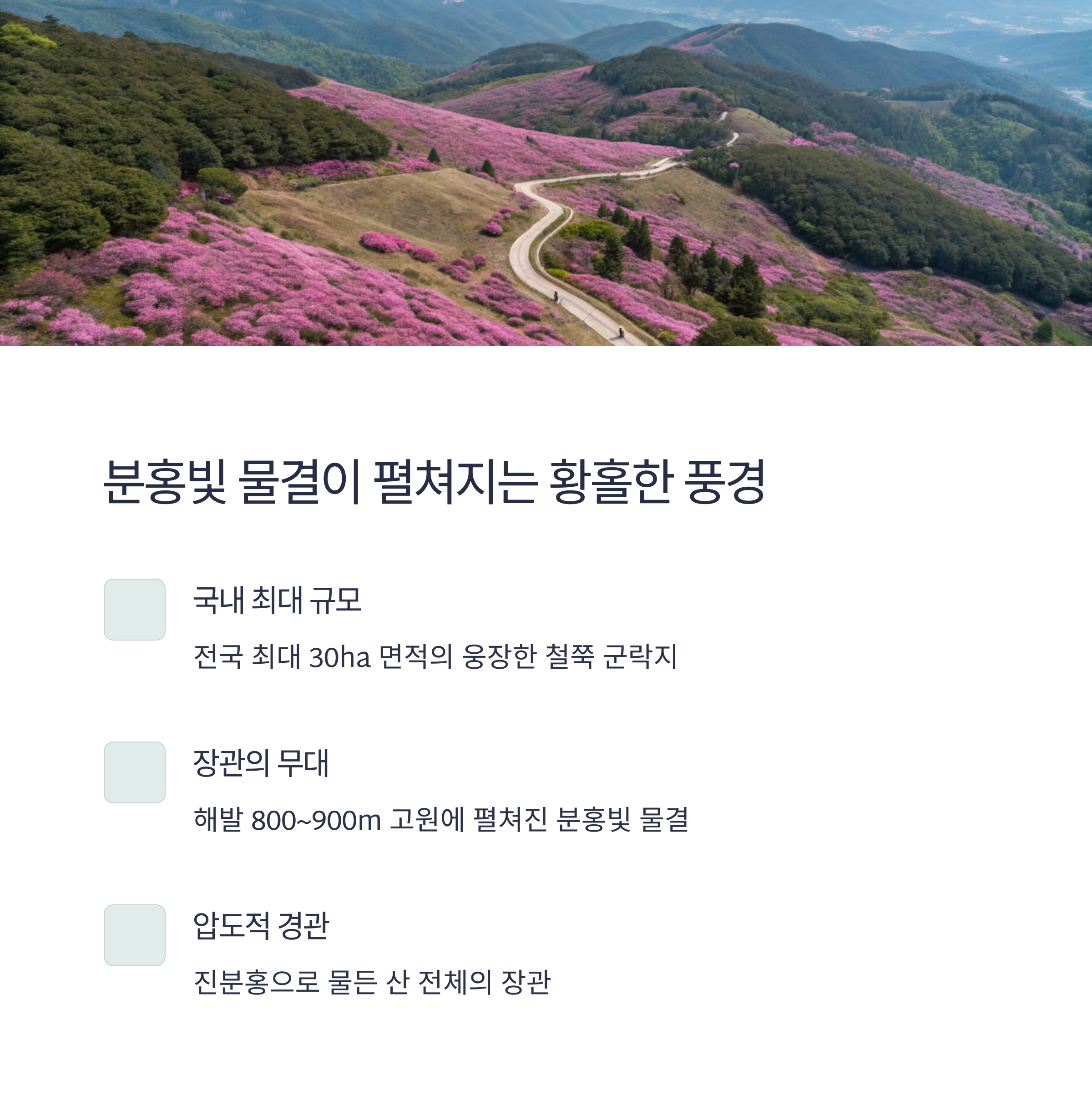 30ha 규모의 철쭉 군락지가 온통 분홍빛으로 물드는 모습은 말 그대로 장관입니다.