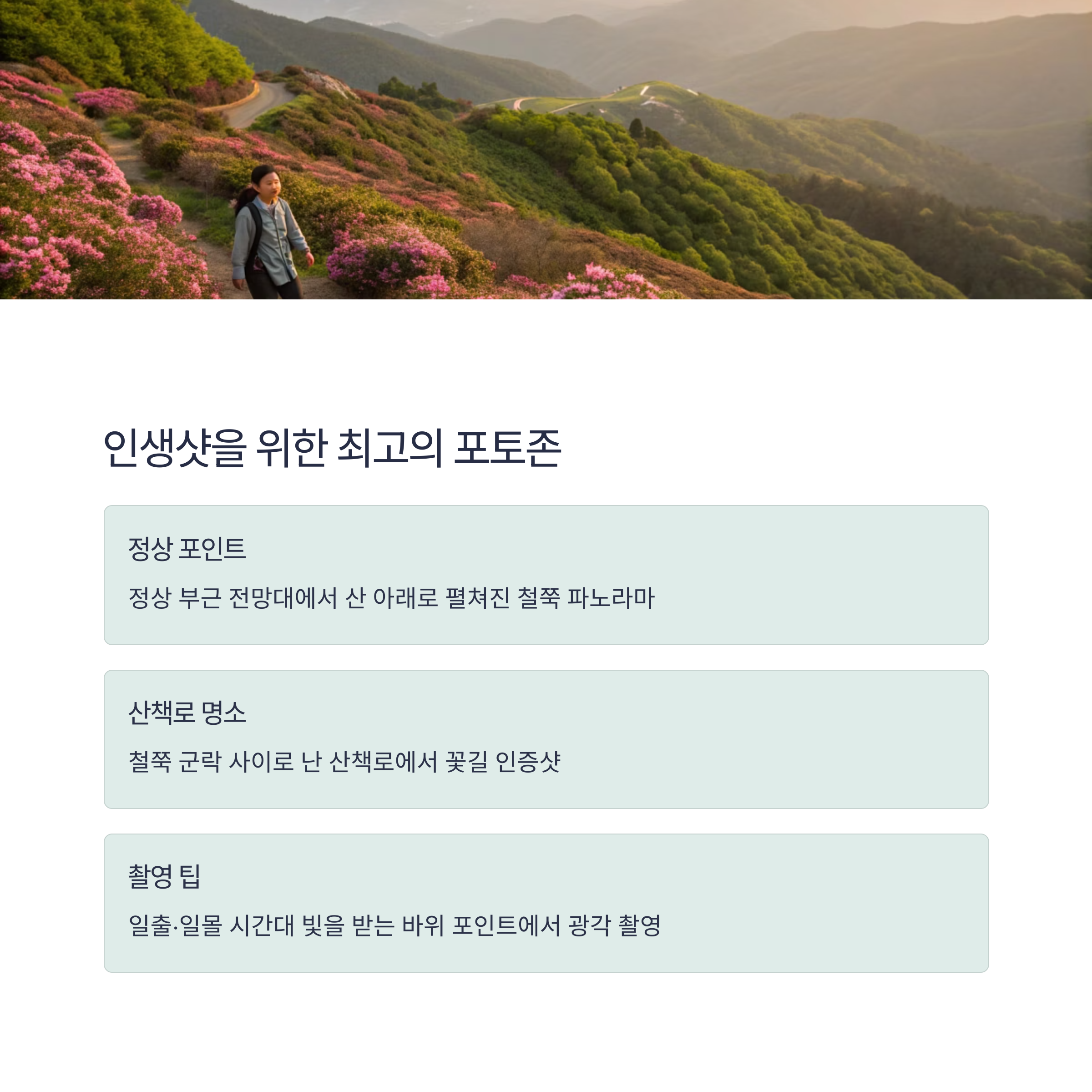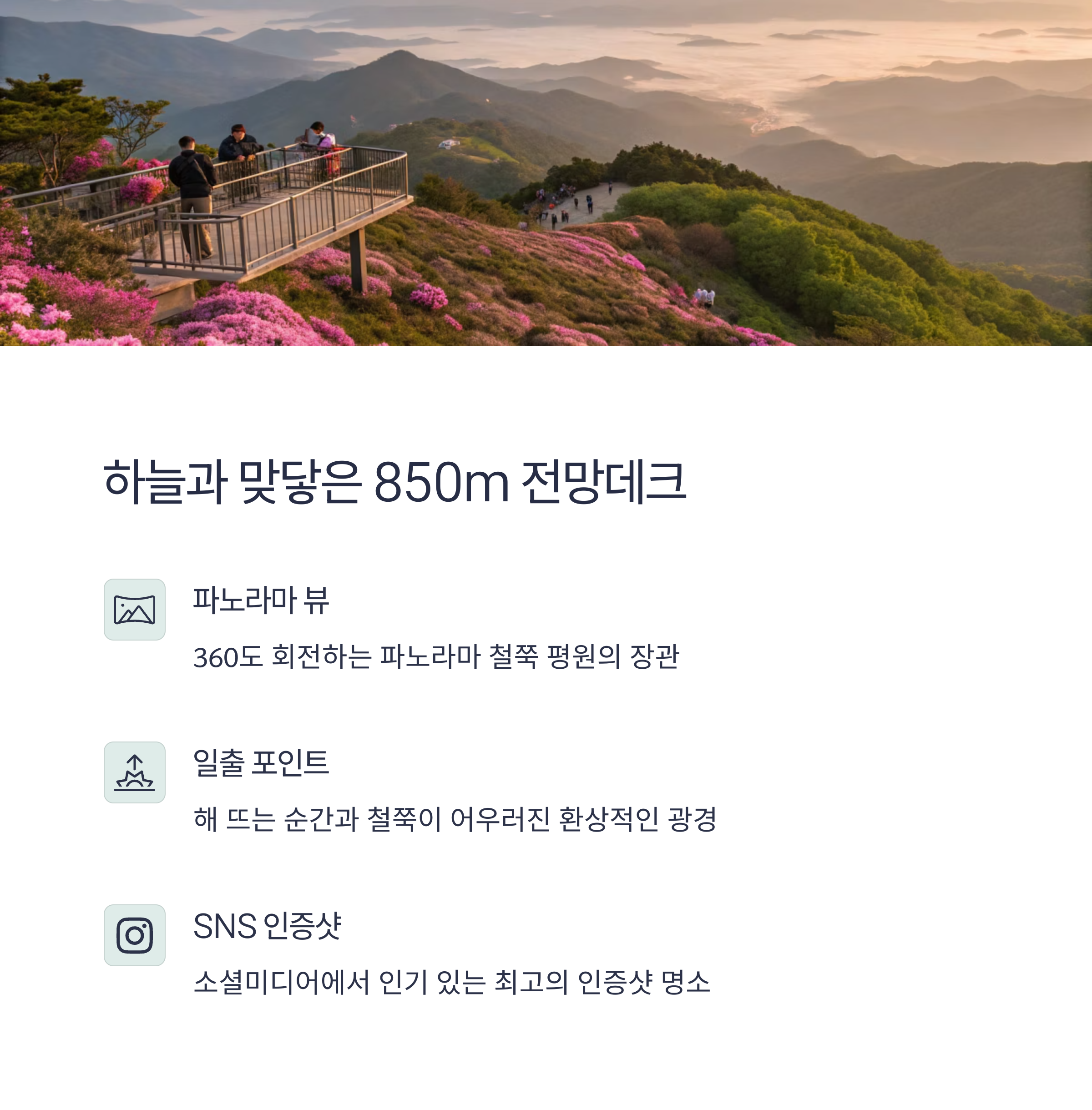해발 850m에 위치한 전망데크에서 바라보는 아침 햇살 속 철쭉 풍경은 잊지 못할 순간을 선사합니다.