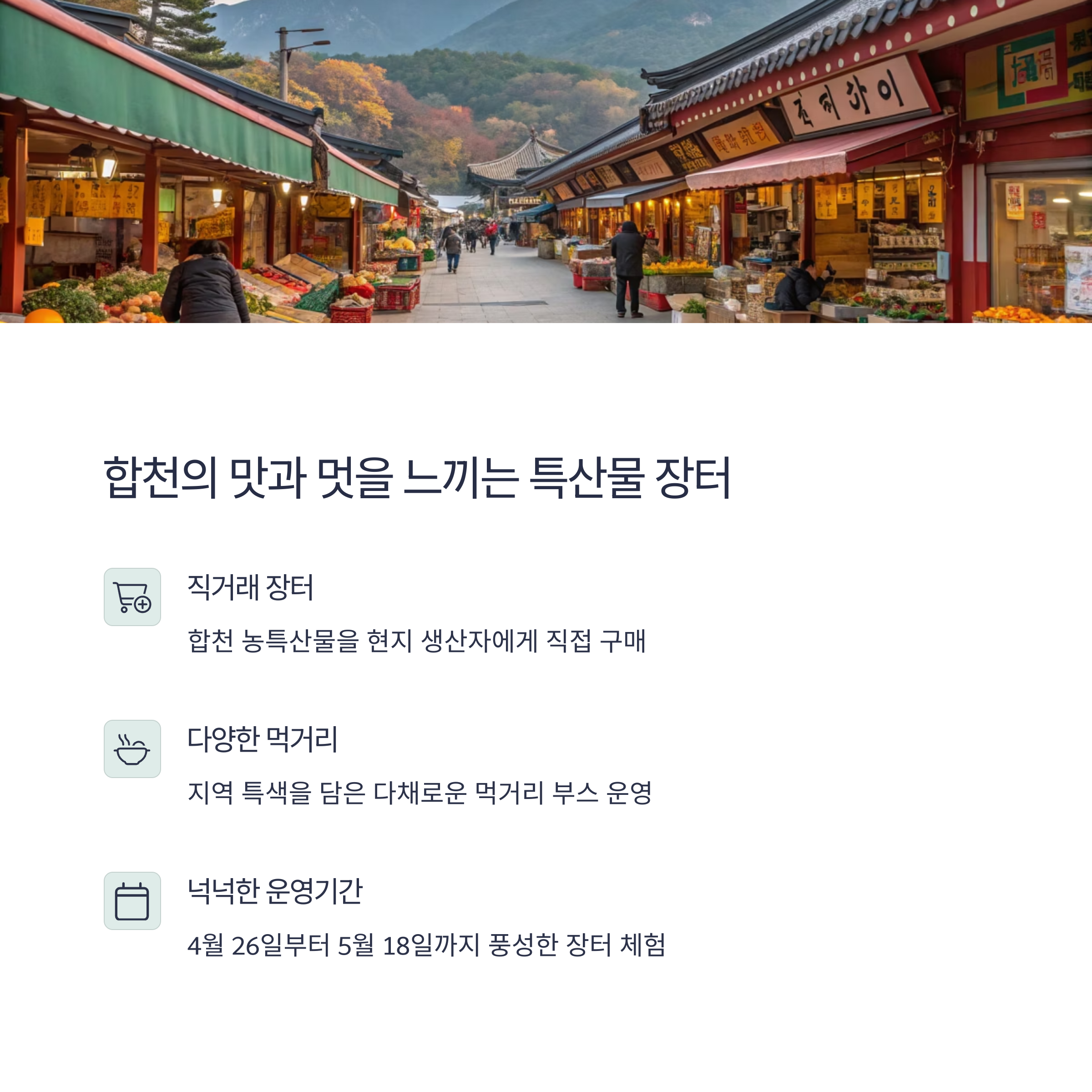 합천의 신선한 농산물과 특산품을 만날 수 있는 장터도 빼놓을 수 없죠.