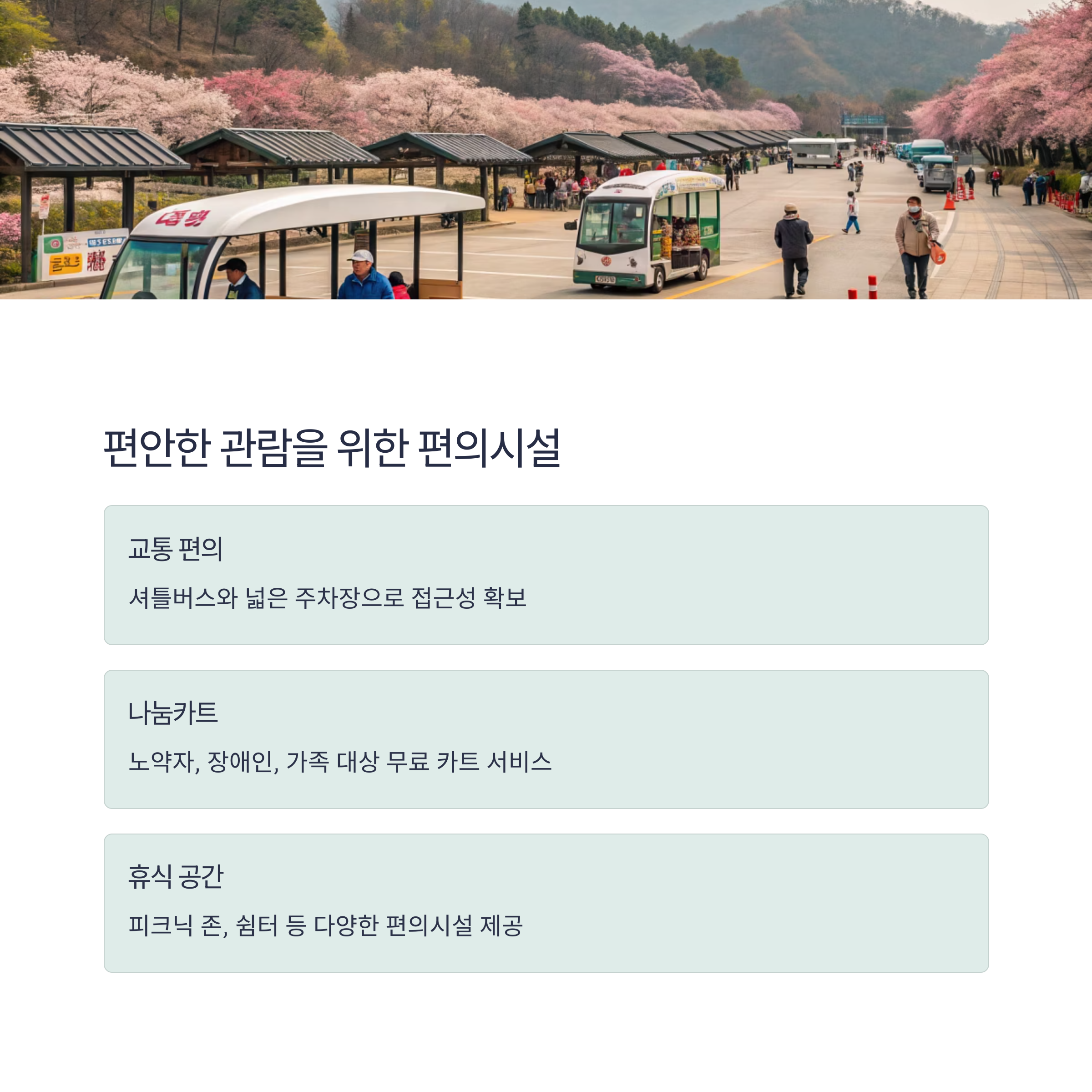 셔틀버스, 도슨트 투어, 나눔카트 등 다양한 편의 서비스가 준비되어 있어 이동도 편리합니다.