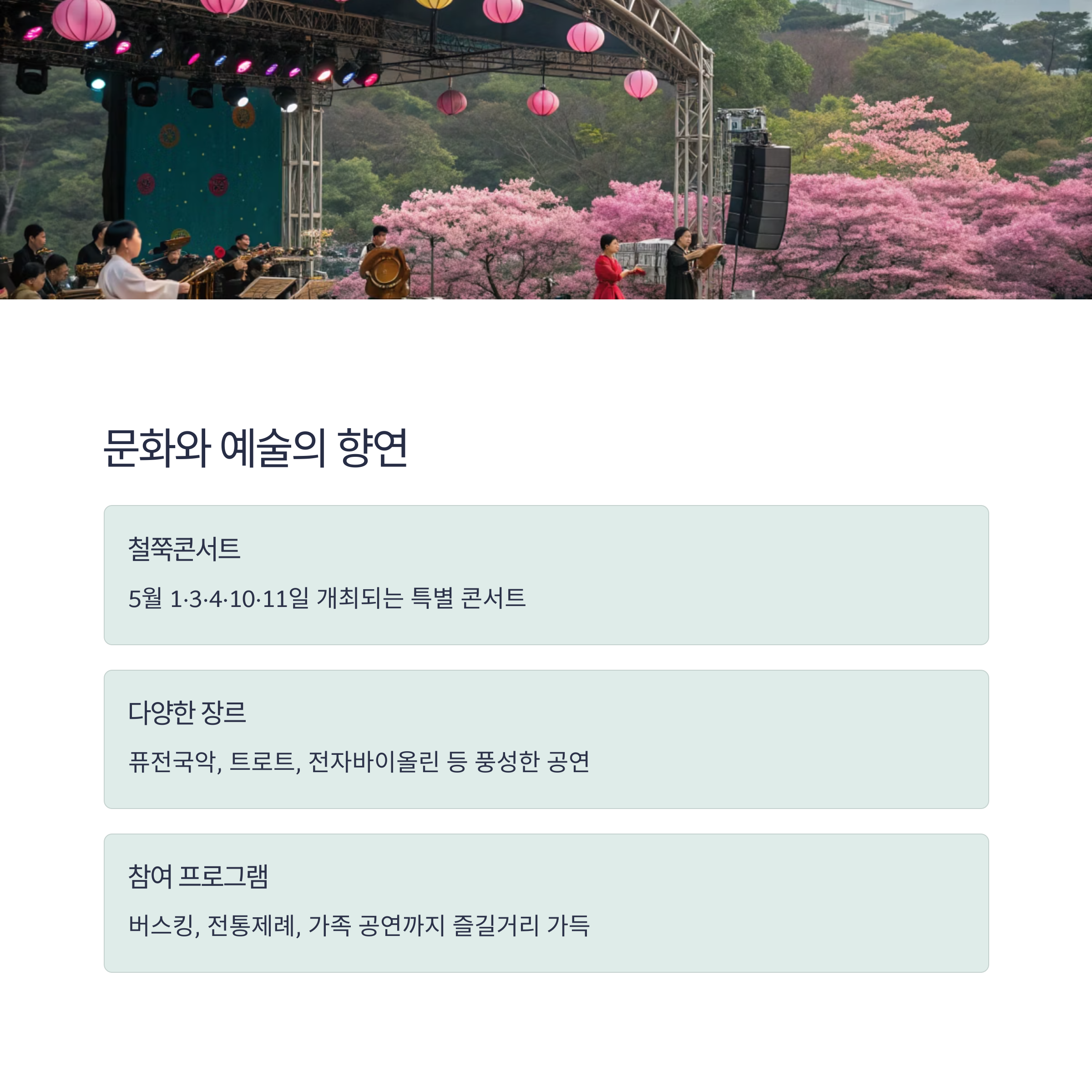 전통 공연부터 현대 음악까지, 남녀노소 누구나 즐길 수 있는 무대가 준비되어 있어요.